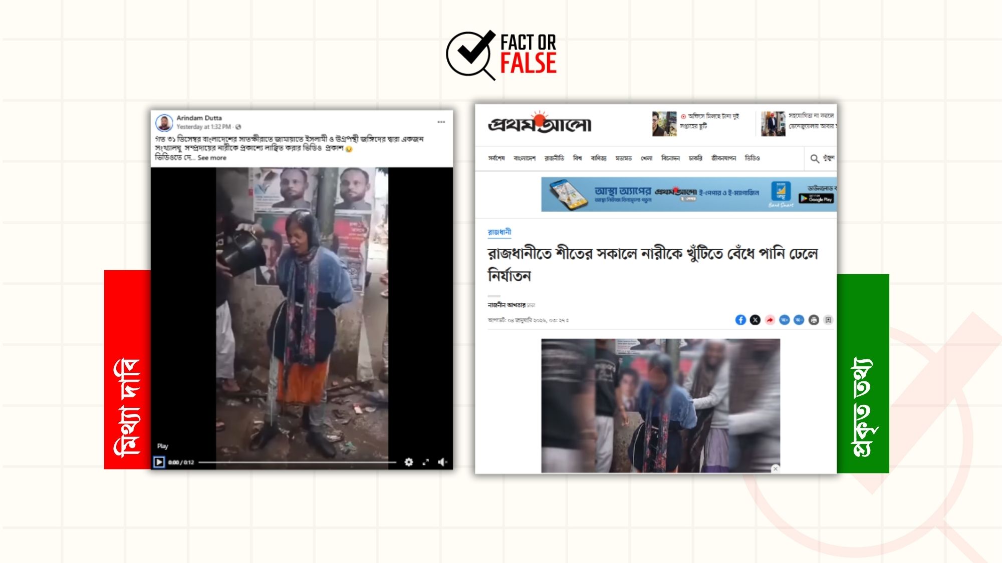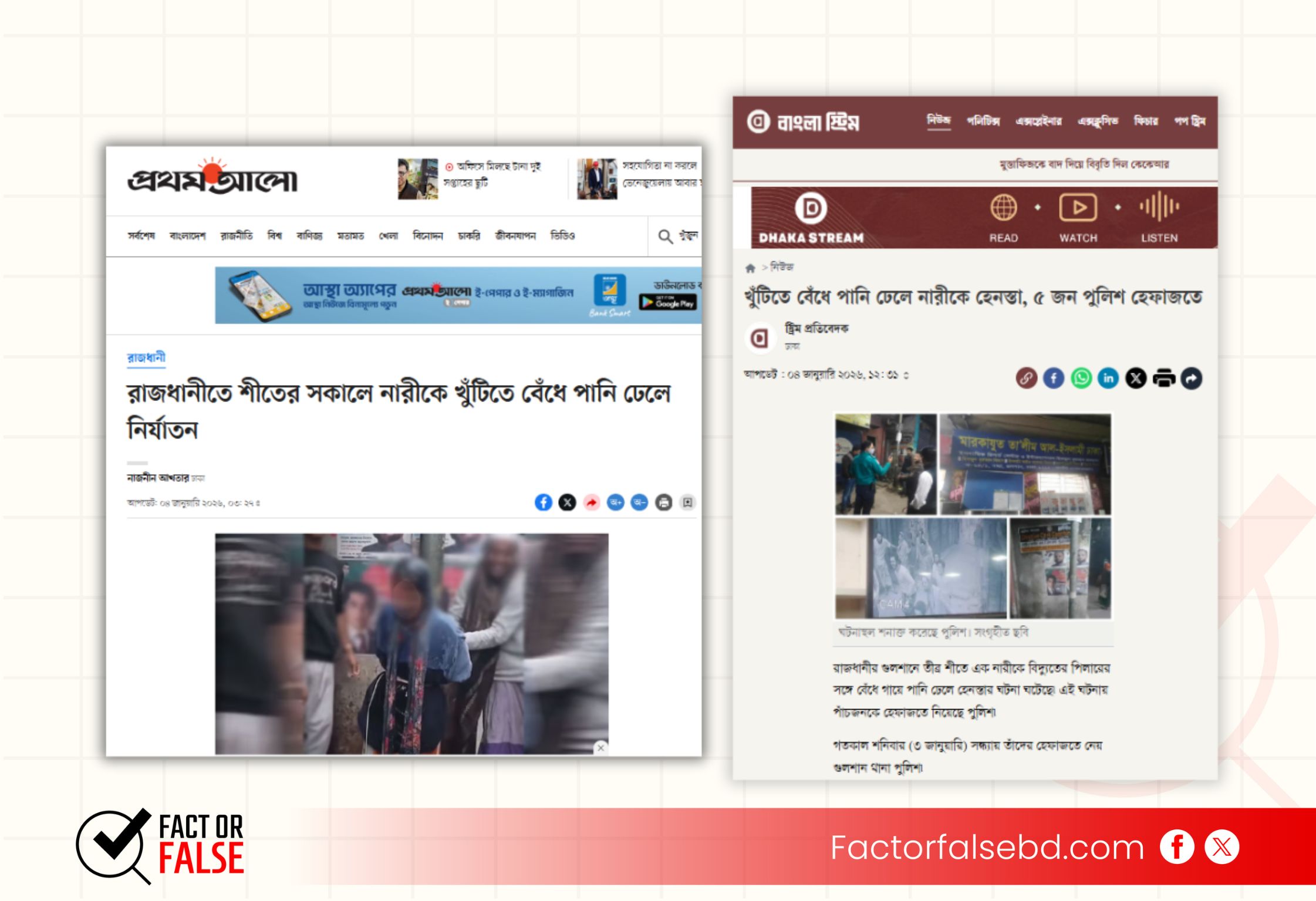 যাচাইয়ের শুরুতে প্রাসঙ্গিক কিওয়ার্ড সার্চ করে এ বিষয়ে দৈনিক প্রথম আলোতে ৪ জানুয়ারি “রাজধানীতে শীতের সকালে নারীকে খুঁটিতে বেঁধে পানি ঢেলে নির্যাতন” শিরোনামে প্রকাশিত একটি প্রতিবেদন খুঁজে পাওয়া যায়।