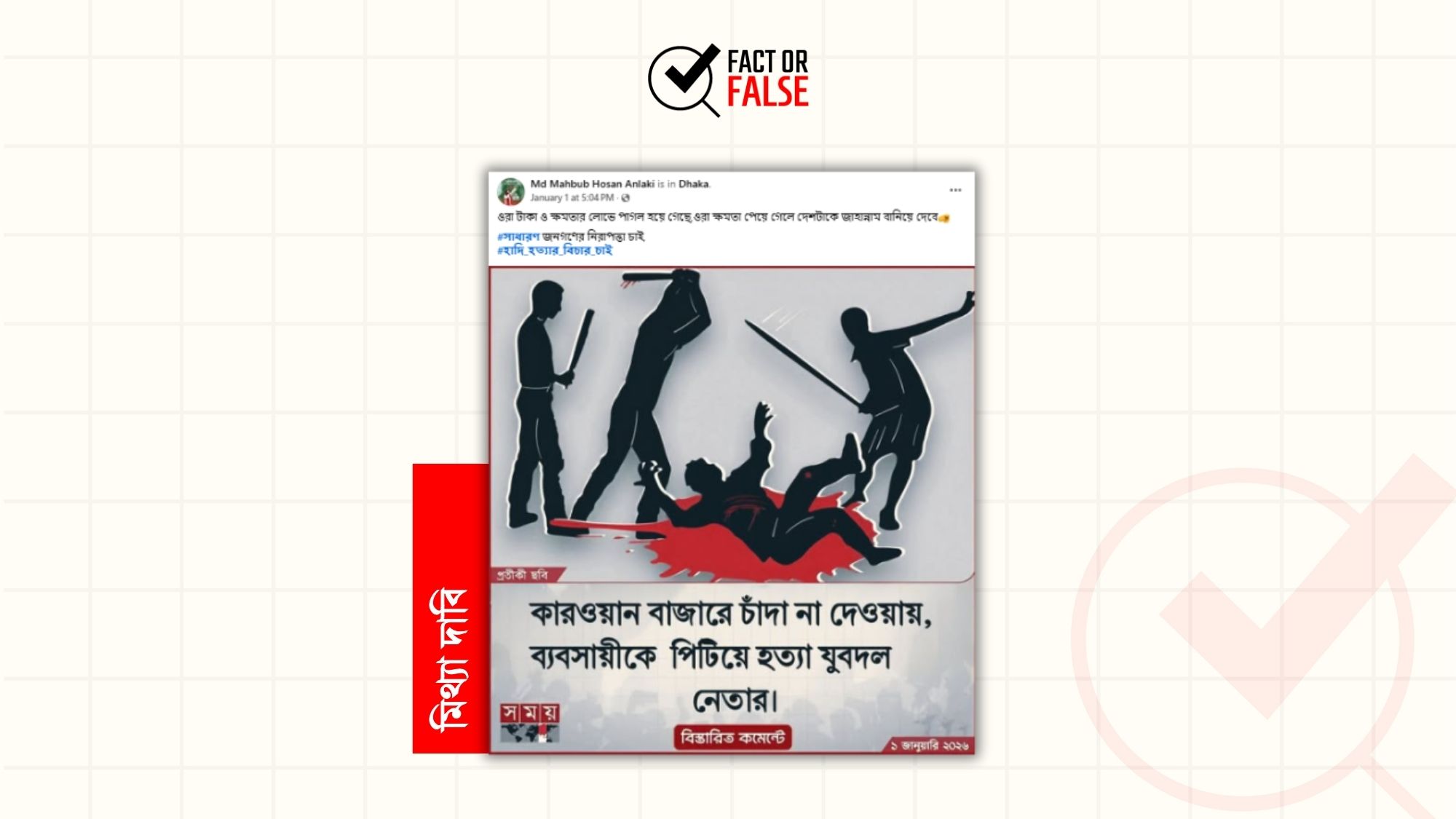 সম্প্রতি, “কারওয়ান বাজারে চাঁদা না দেওয়ায় ব্যবসায়ীকে পিটিয়ে হত্যা যুবদল নেতার” শিরোনামে সময় টিভির ডিজাইন সংবলিত একটি ফটোকার্ড ছড়িয়ে পড়েছে সামাজিক যোগাযোগ মাধ্যম ফেসবুকে।