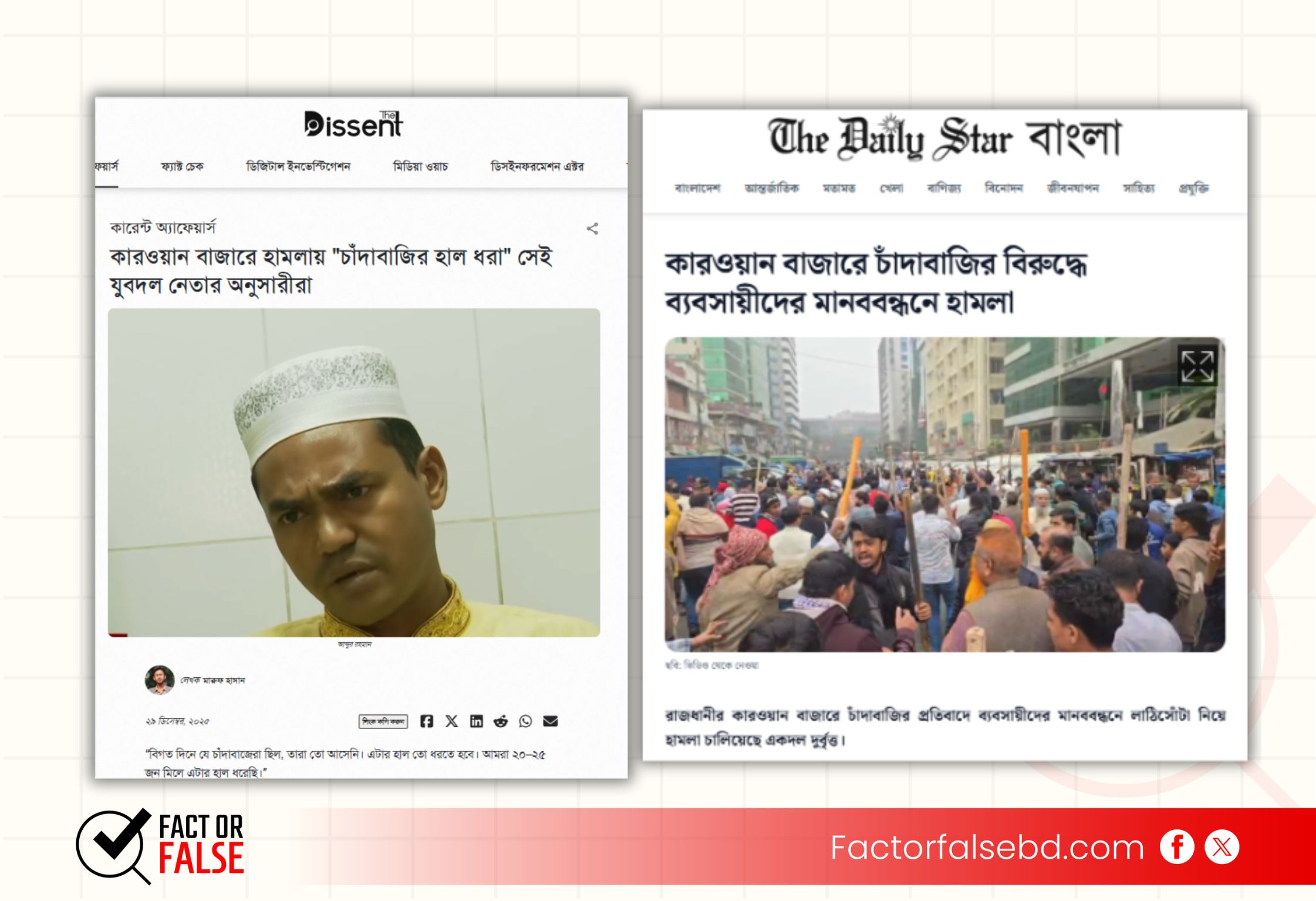 সোমবার ২৯  ডিসেম্বর ২০২৫ এ ডেইলি স্টারে প্রকাশিত “কারওয়ান বাজারে চাঁদাবাজির বিরুদ্ধে ব্যবসায়ীদের মানববন্ধনে হামলা” শিরোনামে একটি প্রতিবেদন খুঁজে পাওয়া যায়।