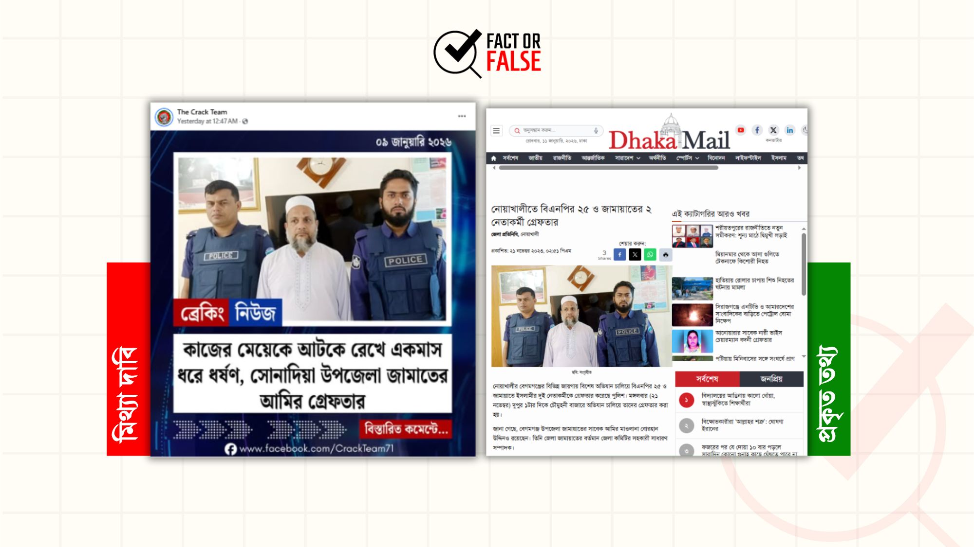 অন্যদিকে, রিভার্স ইমেজ সার্চে ফটোকার্ডে ব্যবহার করা ছবির সাথে পুরোপুরি মিল আছে এমন একটি সংবাদ পাওয়া যায় অনলাইন সংবাদ মাধ্যম ঢাকা মেইলের। ২০২৩ সালের নভেম্বরে প্রকাশিত সংবাদটির শিরোনাম ছিল, “নোয়াখালীতে বিএনপির ২৫ ও জামায়াতের ২ নেতাকর্মী গ্রেফতার।”