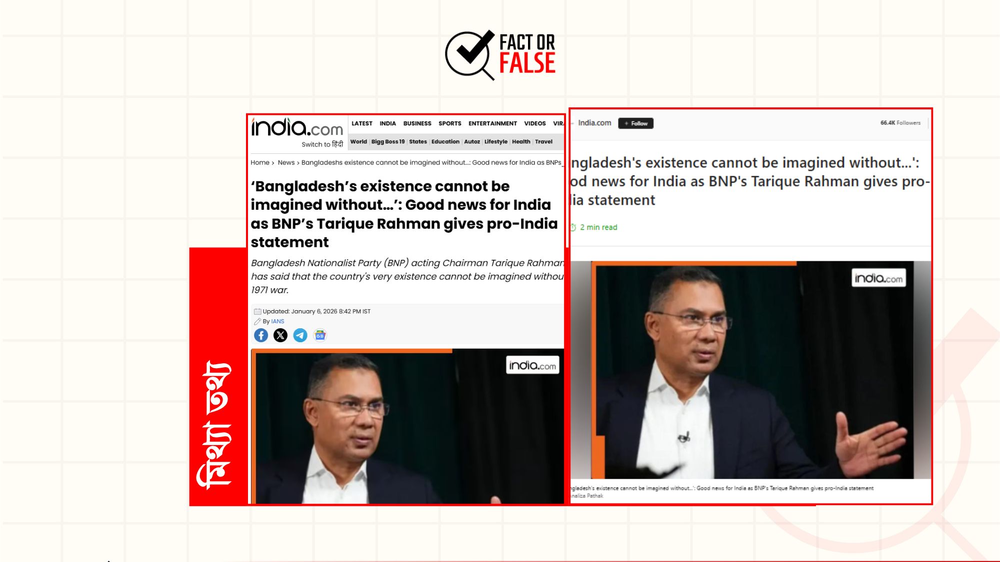 “…ছাড়া বাংলাদেশের অস্তিত্ব কল্পনা করা যায় না’ : বিএনপির তারেক রহমানের ভারতপন্থী বক্তব্যে ভারতের জন্য সুখবর।” এবং “বাংলাদেশের অস্তিত্বের জন্য তারেক রহমান ভারতকে কৃতিত্ব দিচ্ছেন।” দাবি করে সংবাদ প্রকাশ করেছে একাধিক ভারতীয় সংবাদমাধ্যম। তবে যাচাইয়ে দেখা গেছে, শিরোনামের বিপরীতে মূল সংবাদে দাবির পক্ষে প্রমাণ উপস্থাপন করেনি তারা।