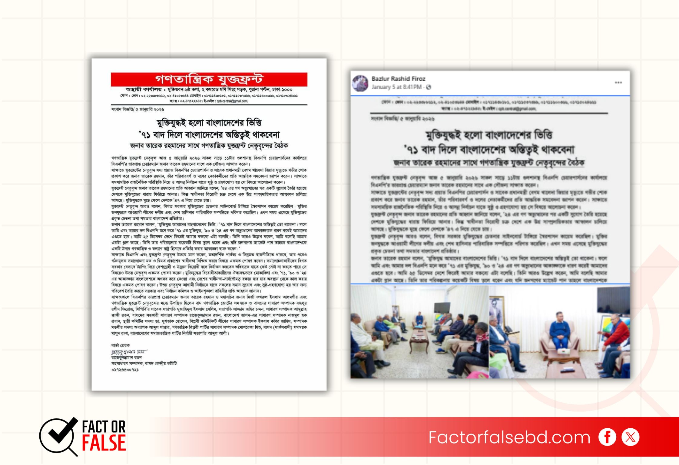 মূলত, গত ৫ই জানুয়ারি বিএনপি চেয়ারপার্সনের গুলশান কার্যালয়ে তারেক রহমানের সাথে গণতান্ত্রিক যুক্তফ্রন্টের নেতাদের একটি বৈঠক অনুষ্ঠিত হয়। বৈঠকে দেশের রাজনৈতিক পরিস্থিতি, আইনশঙ্খলা- অর্থনৈতিক পরিস্থিতি, উগ্রবাদের উত্থান ও আসন্ন জাতীয় নির্বাচন নিয়ে আলোচনা হয়েছে। আলোচনায় তারেক রহমান দলের পক্ষ থেকে বক্তব্য উপস্থাপন করেন। আলোচনার বিষয়ে গণতান্ত্রিক যুক্তফ্রন্টের পক্ষ থেকে যে বিবৃতি পাঠানো হয় তাতেও ভারতের বিষয়ে কিছু উল্লেখ করা হয়নি।