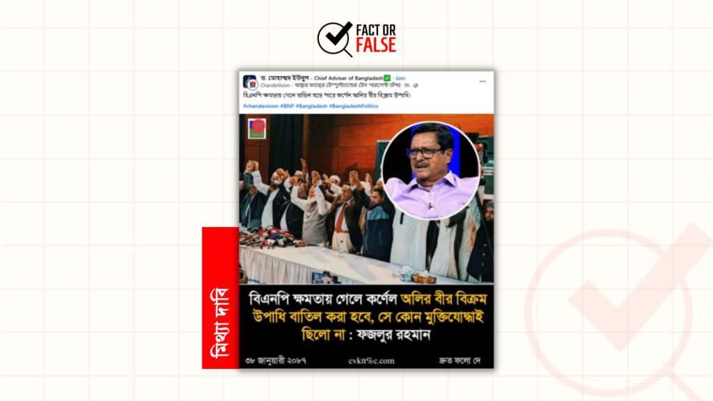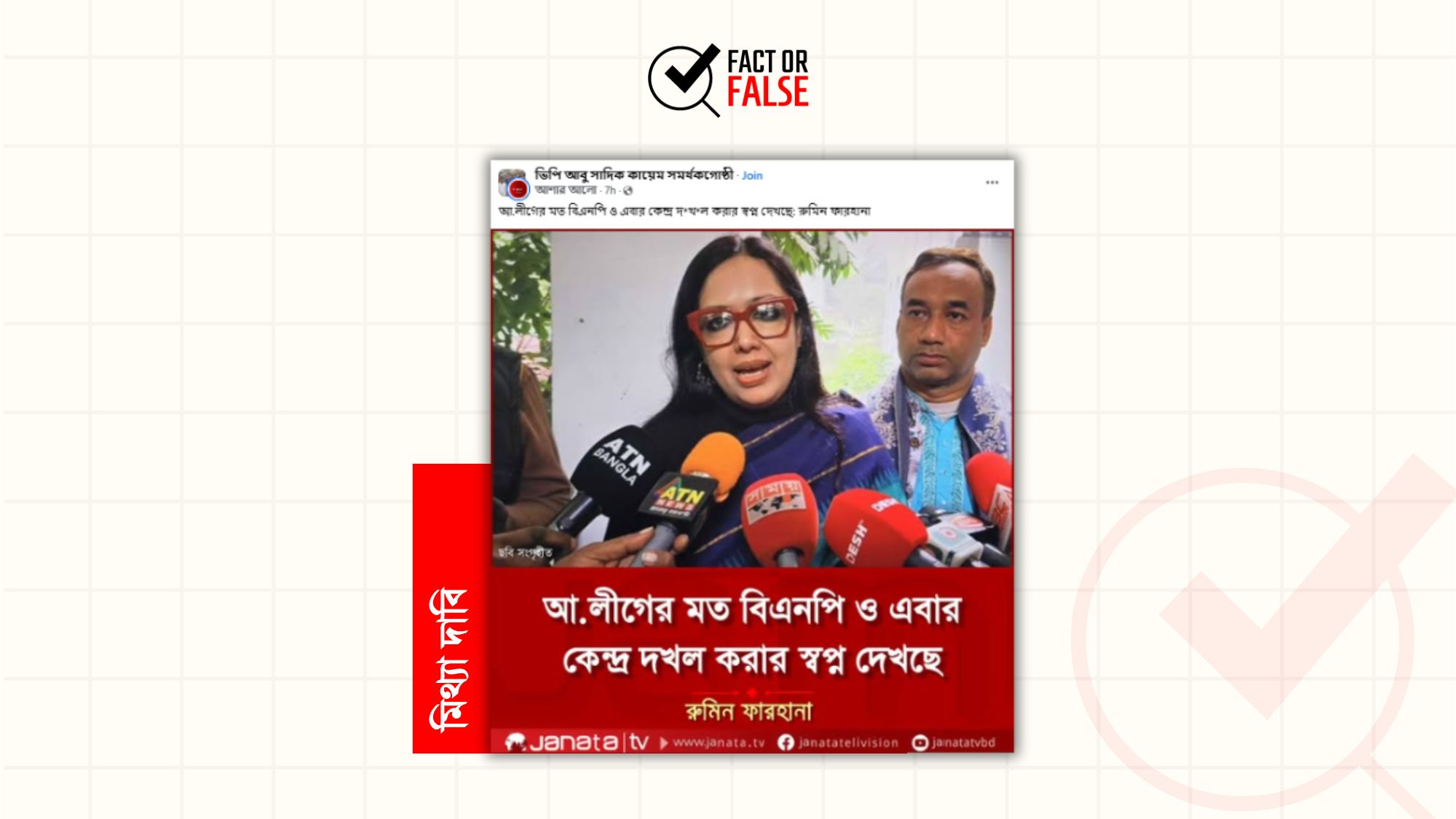 সামাজিক যোগাযোগমাধ্যমে ব্রাহ্মণবাড়িয়া-২ আসনের স্বতন্ত্র প্রার্থী ও বিএনপির বহিষ্কৃত আন্তর্জাতিক-বিষয়ক সহসম্পাদক রুমিন ফারহানার নামে ছড়ানো যমুনা টেলিভিশনের ফটোকার্ডের আদলে তৈরি ‘Janata Tv’ লেখা একটি ফটোকার্ডে দাবি করা হচ্ছে, তিনি বলেছেন, “আ.লীগের মত বিএনপি ও এবার কেন্দ্র দখল করার স্বপ্ন দেখছে।”