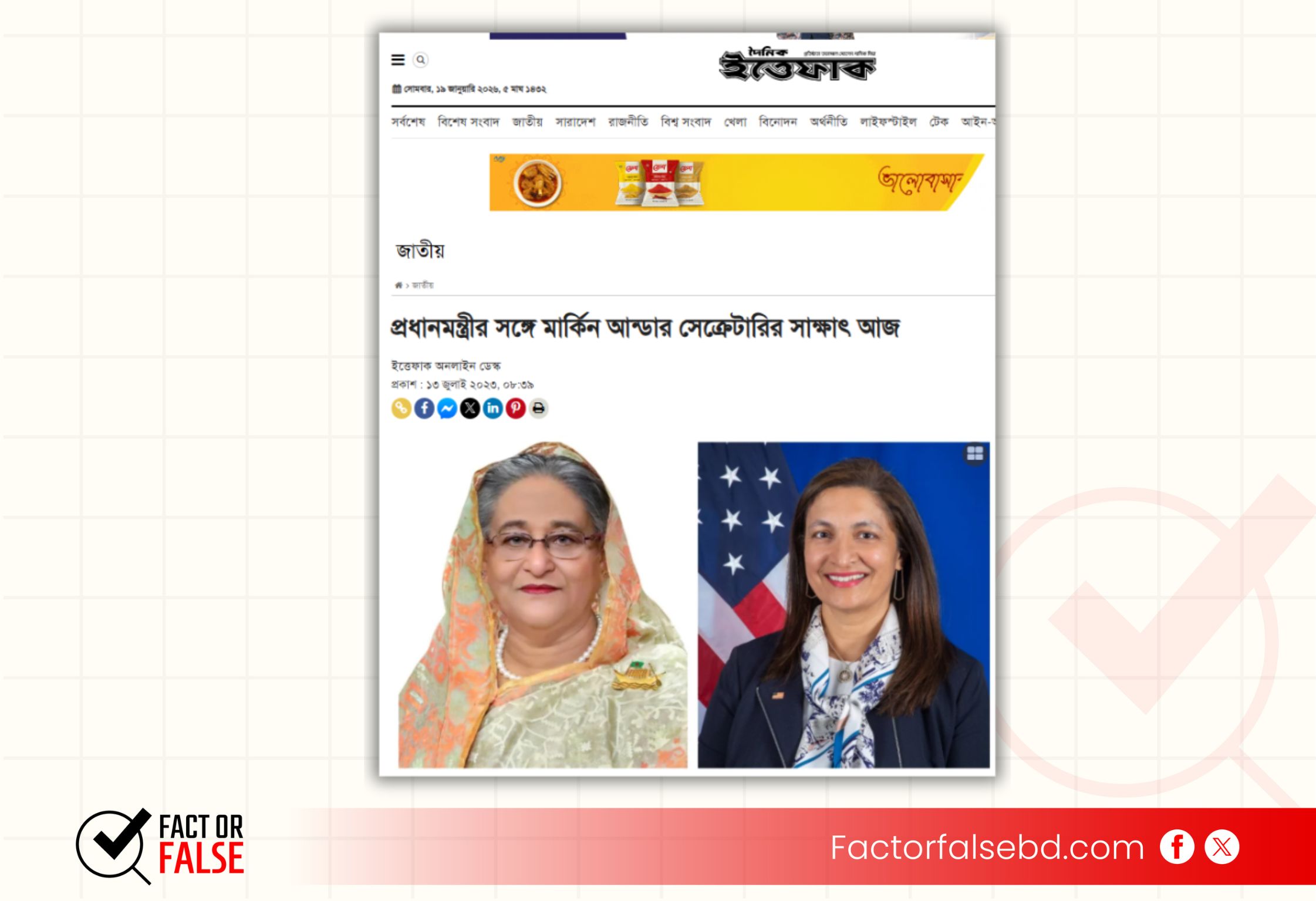 তবে আলোচিত ফটোকার্ডের ছবিটি রিভার্স ইমেজ সার্চ করলে দৈনিক ইত্তেফাকে  ১৩ জুলাই ২০২৩ এ “প্রধানমন্ত্রীর সঙ্গে মার্কিন আন্ডার সেক্রেটারির সাক্ষাৎ আজ” শিরোনামে প্রকাশিত একটি প্রতিবেদন খুঁজে পাওয়া যায়। প্রতিবেদনে ব্যবহৃত ছবির সাথে আলোচিত ফটোকার্ডের ছবির মিল রয়েছে।