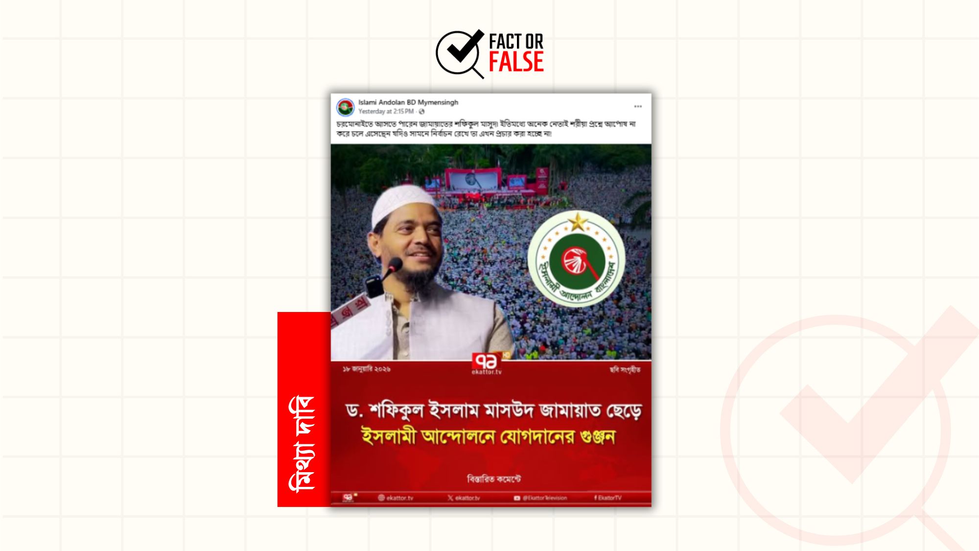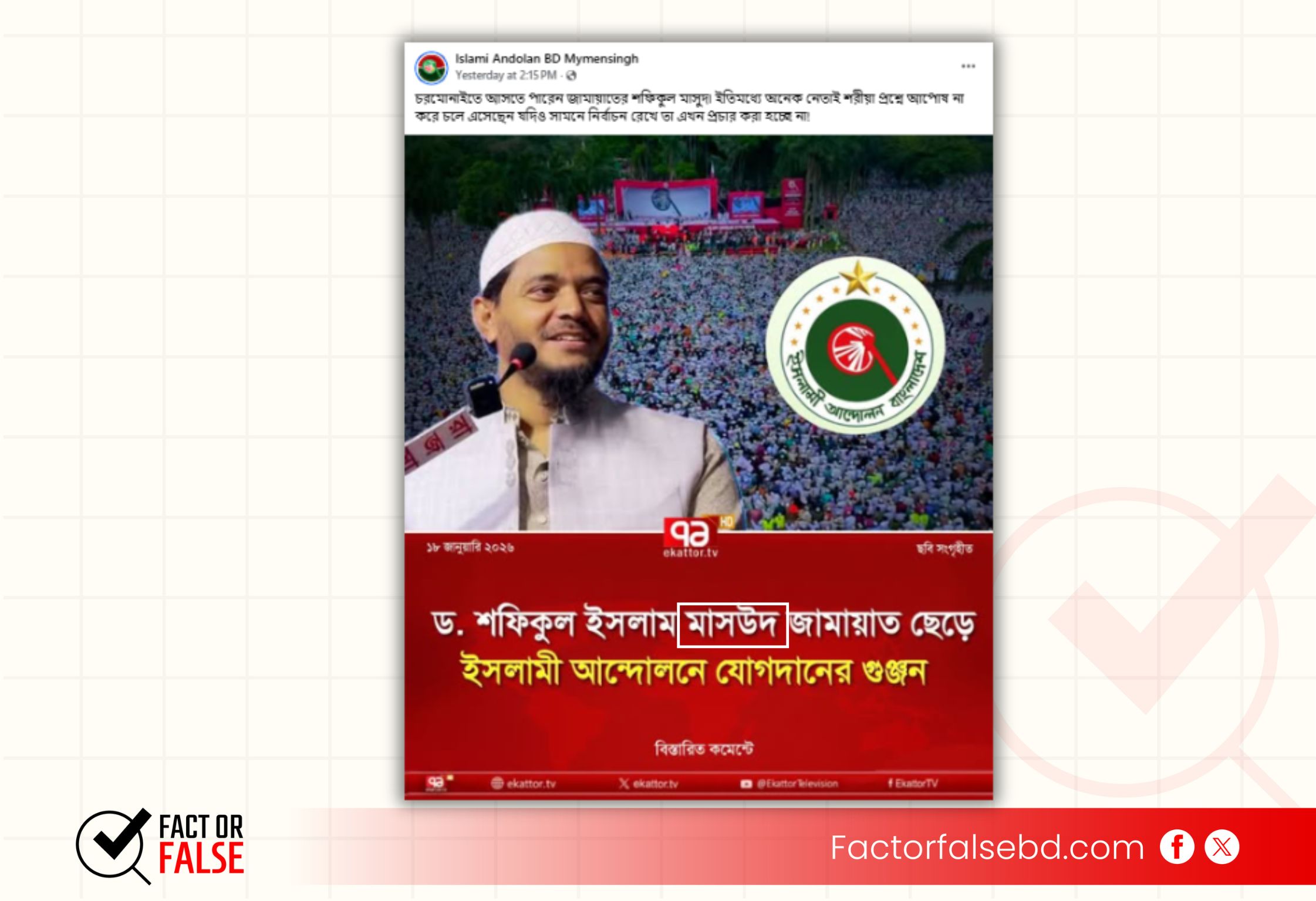 সুতরাং, “ড. শফিকুল ইসলাম মাসউদ জামায়াত ছেড়ে ইসলামী আন্দোলনে যোগদানের গুঞ্জন” শিরোনামে একাত্তর টিভির নামে প্রচারিত ফটোকার্ডটি ভুয়া এবং বিভ্রান্তিকর।