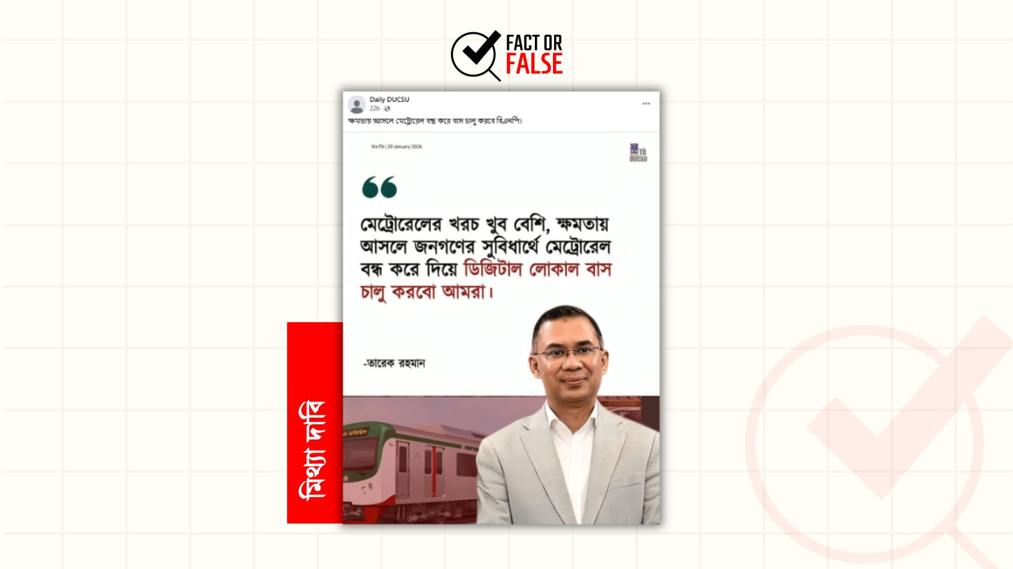 সম্প্রতি সামাজিক যোগাযোগ মাধ্যম ফেসবুকে বিএনপির ভারপ্রাপ্ত চেয়ারম্যান তারেক রহমানের একটি বক্তব্যকে কেন্দ্র করে দাবি করা হচ্ছে যে, বিএনপি ক্ষমতায় গেলে মেট্রোরেল বন্ধ করে বাস চালু করবে। সর্বপ্রথম ‘Daily DUCSU’ নামের একটি ফেসবুক পেজ থেকে তারেক রহমানের ছবি সম্বলিত একটি ’কোটকার্ড’ প্রচার করা হয়। সেখানে দাবি করা হয় তিনি বলেছেন: “মেট্রোরেলের খরচ খুব বেশি, ক্ষমতায় আসলে জনগণের সুবিধার্থে মেট্রোরেল বন্ধ করে দিয়ে ডিজিটাল লোকাল বাস চালু করবো আমরা।”