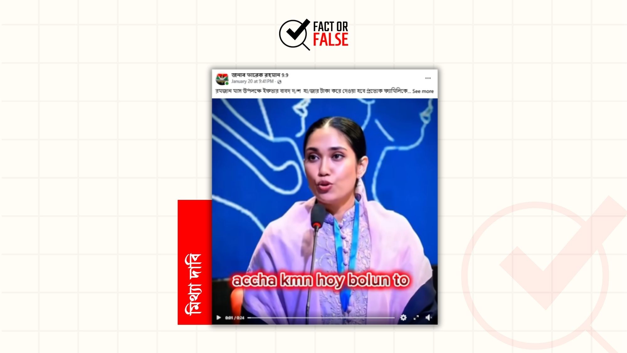 ভিডিওটির সত্যতা যাচাই করার জন্য এটির কী-ফ্রেম রিভার্স সার্চ করে দেখা গেছে, গত ১৮ জানুয়ারি রাজধানীর কৃষিবিদ ইনস্টিটিউট মিলনায়তনে অনুষ্ঠিত এক আলোচনা সভায় বক্তব্য দেয়ার সময় তোলা জায়মা রহমানের ছবিটি নেয়া হয়েছে।