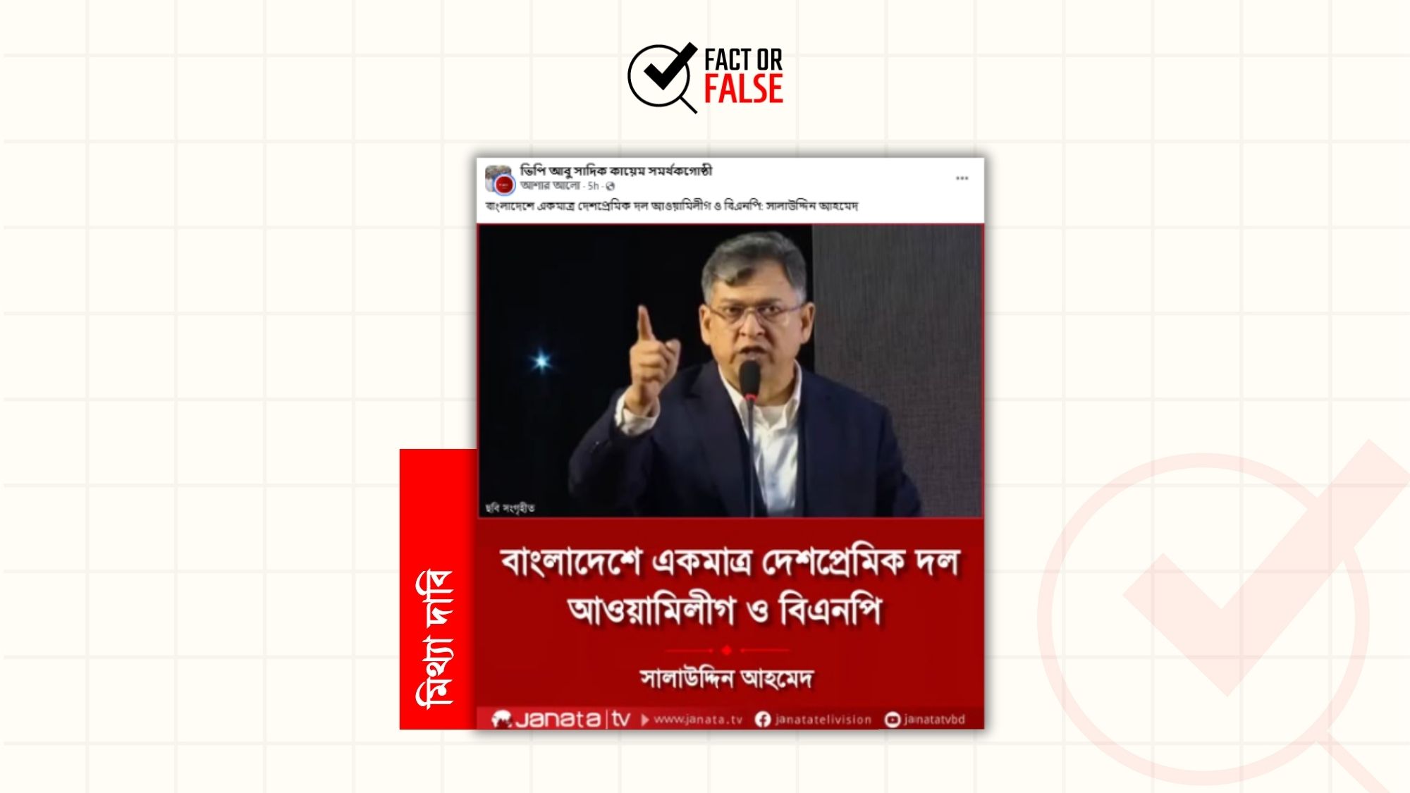“বাংলাদেশে একমাত্র দেশপ্রেমিক দল আওয়ামিলীগ ও বিএনপি” বিএনপির স্থায়ী কমিটির সদস্য সালাউদ্দিন আহমেদ এমন বক্তব্য দিয়েছেন দাবি করে একটি ফটোকার্ড সামাজিক যোগাযোগ মাধ্যম ফেসবুকে ছড়ানো হয়েছে।