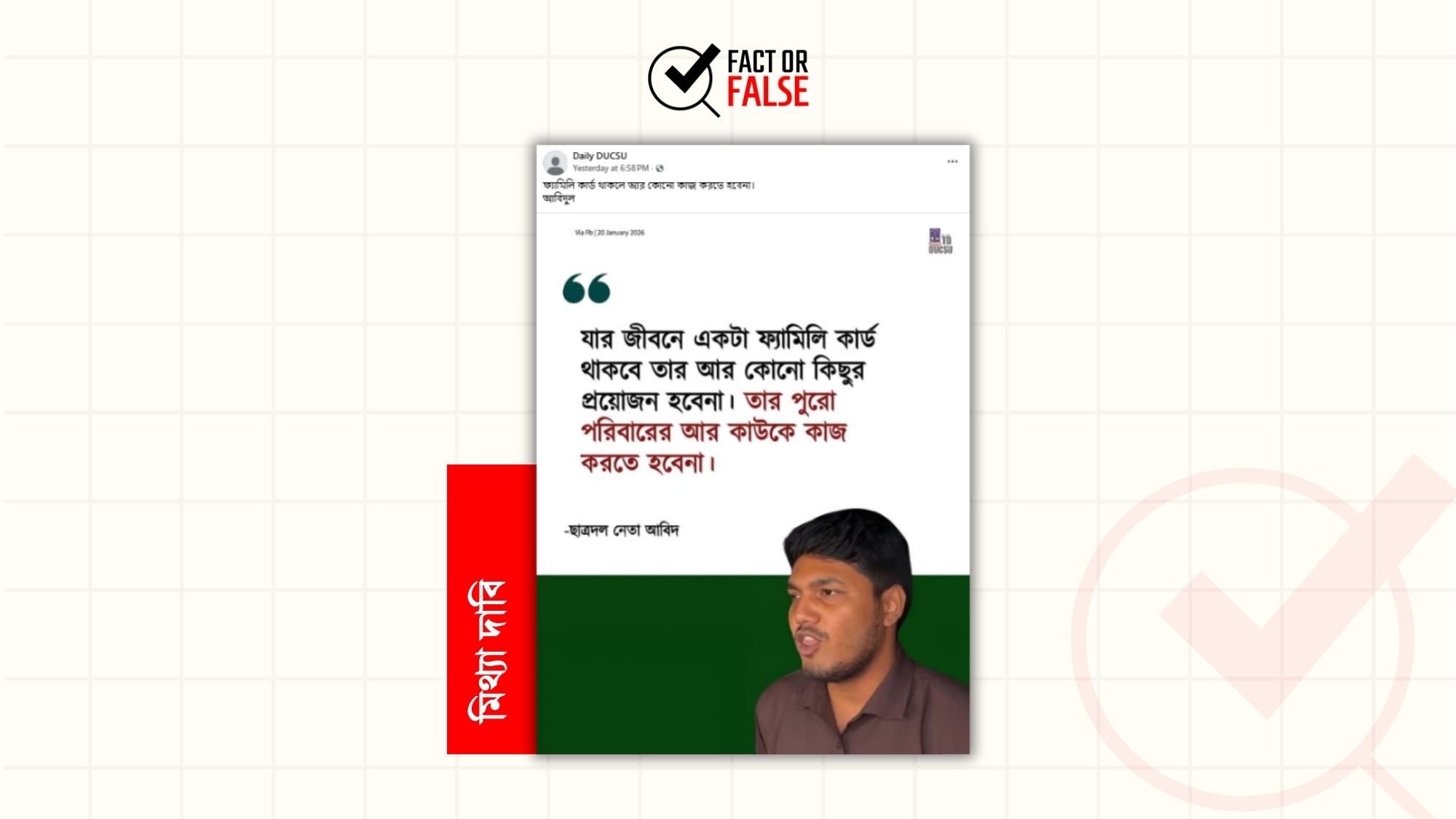 সুতরাং, “যার জীবনে একটা ফ্যামিলি কার্ড থাকবে তার আর কোনো কিছুর প্রয়োজন হবেনা। তার পুরো পরিবারের আর কাউকে কাজ করতে হবে না।” এধরনেরর কোনো বক্তব্যন দেননি ঢাকা বিশ্ববিদ্যালয় শাখা ছাত্রদলের যুগ্ম সাধারণ সম্পাদক আবিদুল ইসলাম খান (আবিদ)। এই দাবিতে প্রচারিত ফটোকার্ডটি ভুয়া।