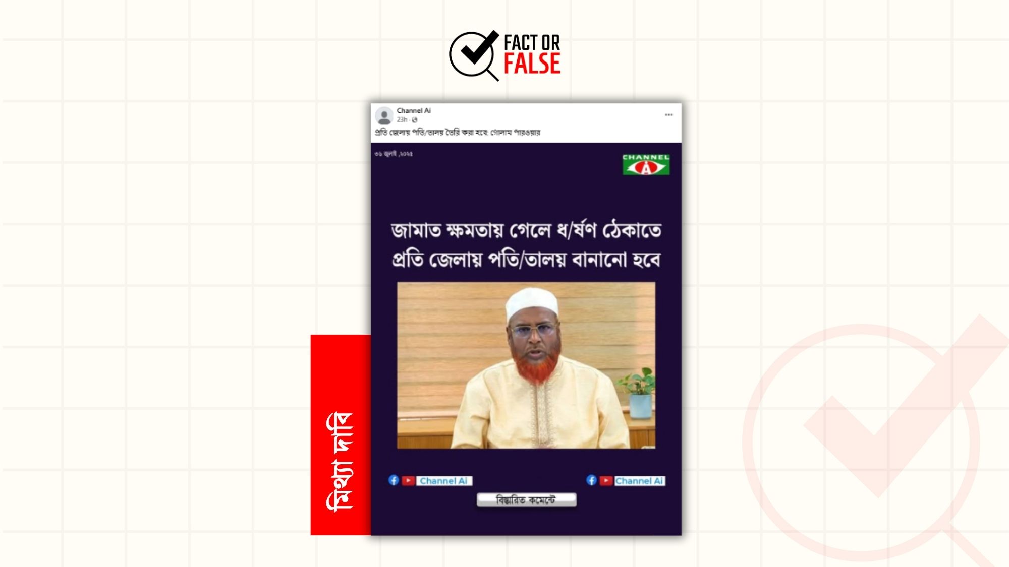 আলোচিত ফটোকার্ডটি লক্ষ্য করলে দেখা যায়, ফটোকার্ডটির উপরে ডান কোনায় চ্যানেল আই এর লোগোর আদলে তৈরি ভুয়া লোগো চ্যানেল এআই এবং প্রকাশের তারিখ হিসেবে ৩৬ জুলাই ২০২৫ উল্লেখ করা হয়েছে। কার্ডের মাঝখানে বাংলাদেশ জামায়াতে ইসলামীর সেক্রেটারি জেনারেল মিয়া গোলাম পরওয়ারের ছবি এবং তার নিচেই শিরোনাম “জামাত ক্ষমতায় গেলে ধ/র্ষণ ঠেকাতে প্রতি জেলায় পতি/তালয় বানানো হবে” লেখা হয়েছে। চ্যানেল এআই নামে কোন স্বীকৃত মিডিয়া নেই বাংলাদেশে।