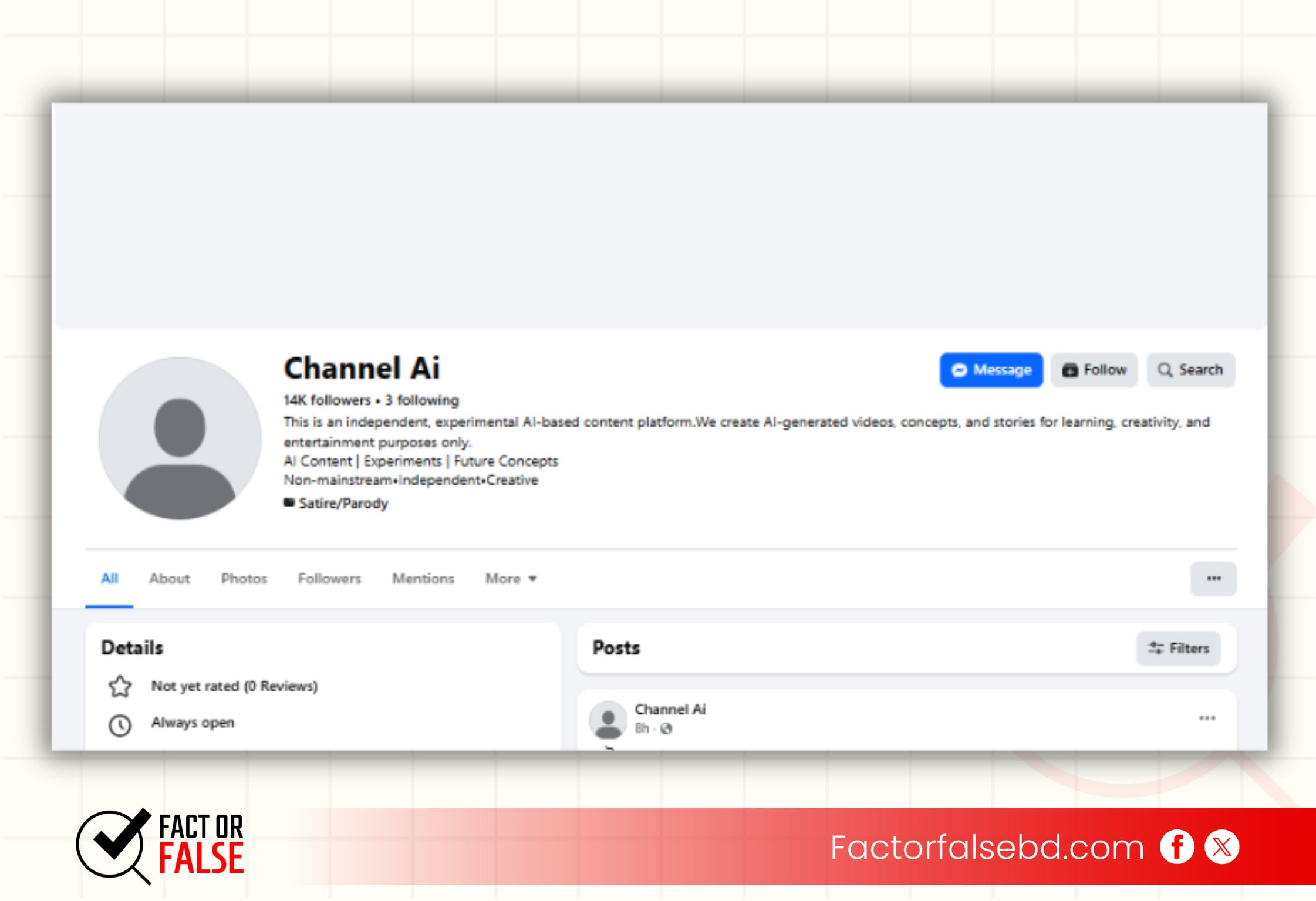 সার্চে Channel Ai পেজটি খুঁজে পাওয়া যায়, যার ইন্ট্রোতে লেখা রয়েছে, “This is an independent, experimental AI-based content platform.We create AI-generated videos, concepts, and stories for learning, creativity, and entertainment purposes only. AI Content | Experiments | Future Concepts Non-mainstream•Independent•Creative”