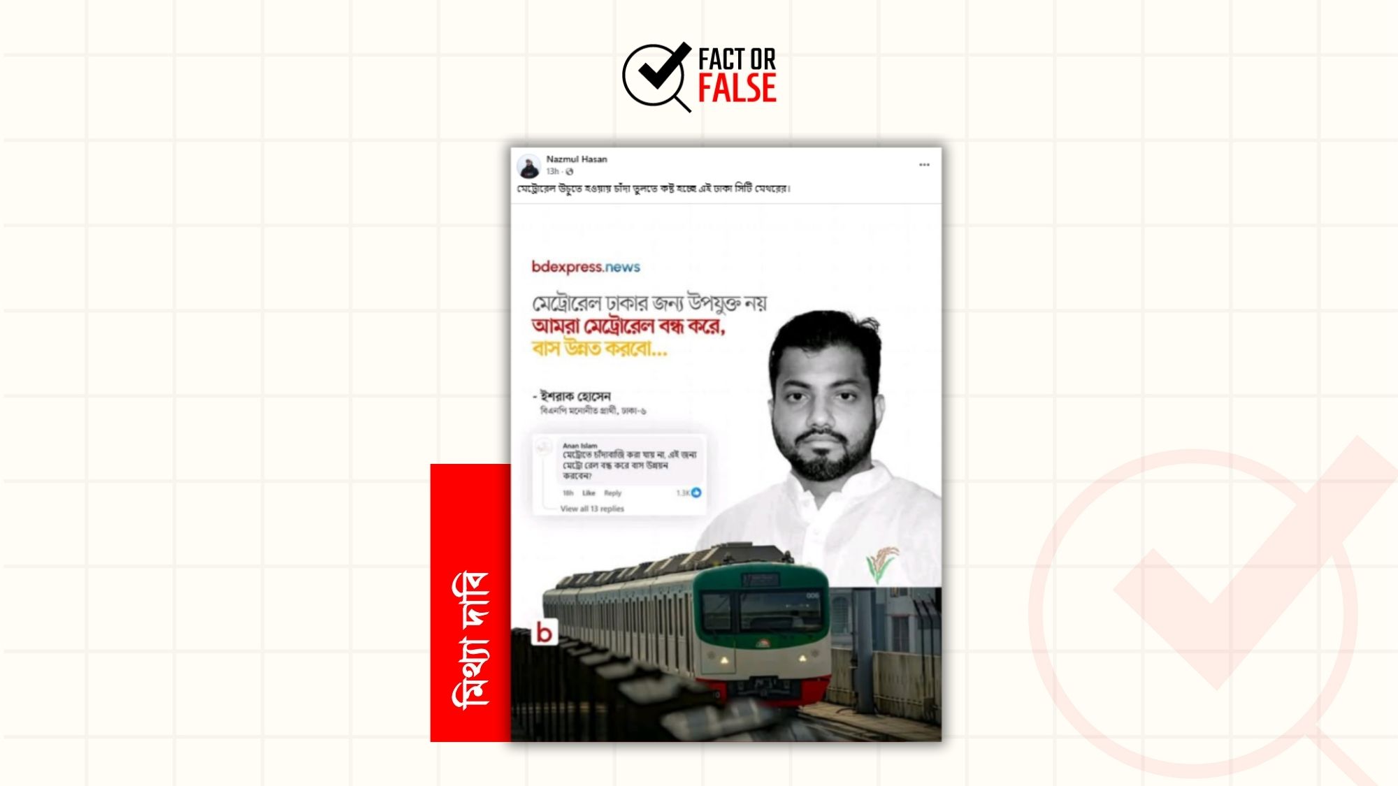 “ঢাকায় মেট্রোরেল উপযুক্ত নয়, আমরা মেট্রোরেল বন্ধ করে বাস উন্নত করবো।” ঢাকা-৬ আসনে বিএনপি মনোনীত সংসদ সদস্যপ্রার্থী ইশরাক হোসেন এমন বক্তব্য দিয়েছেন দাবি করে একটি ফটোকার্ড সামাজিক যোগাযোগ মাধ্যমে ছড়ানো হচ্ছে।