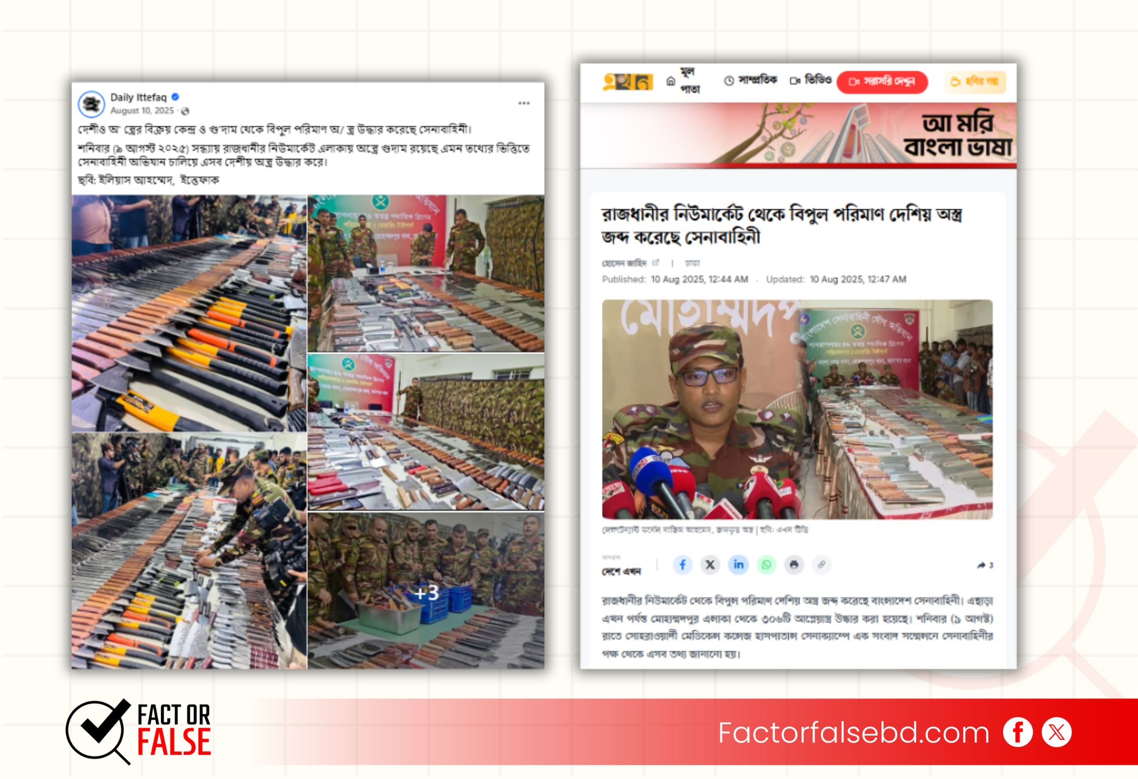 অস্ত্রের ছবির বিষয়ে যাচাইয়ে মূলধারার সংবাদমাধ্যম ‘ইত্তেফাক’ এর ফেসবুক পেজে গত বছরের ১০ আগস্টে প্রচারিত একটি পোস্ট পাওয়া যায়। পোস্টে ৭টি ছবির সংযুক্তি পাওয়া যায় যার একটির সাথে আলোচিত দাবিতে প্রচারিত অস্ত্রের ছবির মিল পাওয়া যায়। এ বিষয়ে ইত্তেফাকের পোস্টের ক্যাপশনে বলা হয়, ‘দেশীও অ’ স্ত্রের বিক্রয় কেন্দ্র ও গু’দাম থেকে বিপুল পরিমাণ অ/ স্ত্র উদ্ধার করেছে সেনাবাহিনী। শনিবার (৯ আগস্ট ২০২৫) সন্ধ্যায় রাজধানীর নিউমার্কেট এলাকায় অস্ত্রে গুদাম রয়েছে এমন তথ্যের ভিত্তিতে সেনাবাহিনী অভিযান চালিয়ে এসব দেশীয় অস্ত্র উদ্ধার করে।’