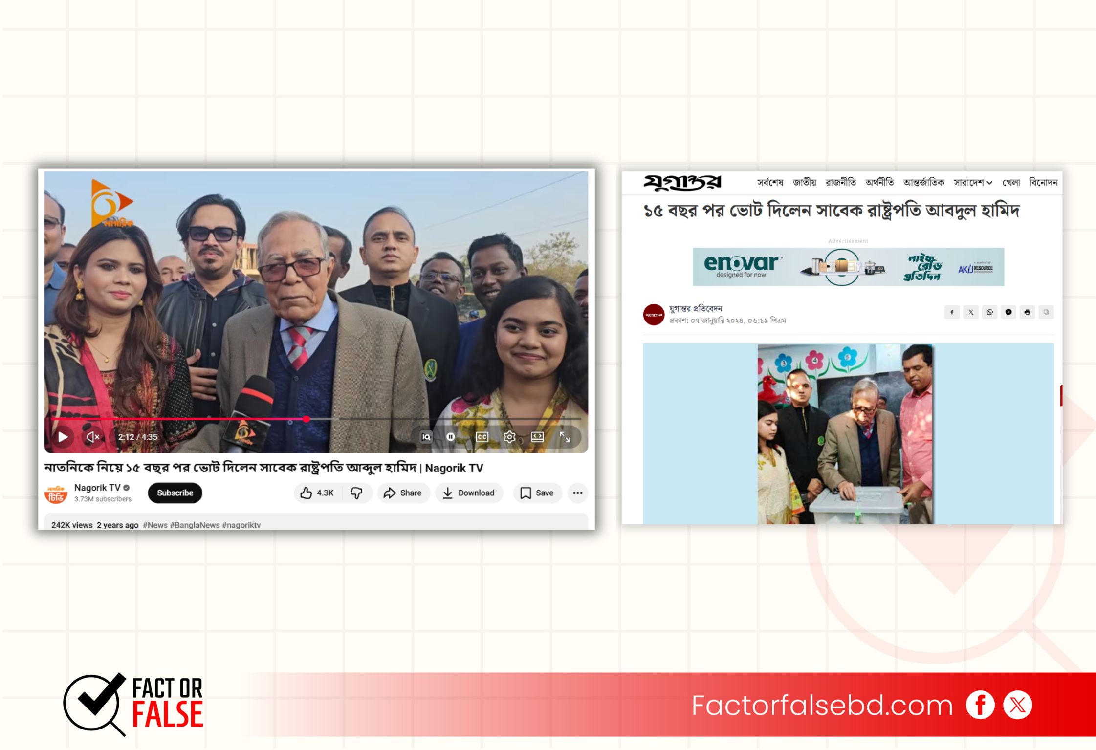 অর্থাৎ, “আওয়ামী লীগের আমলে ভোট দেওয়ার সুযোগ পাননি স্বয়ং সাবেক রাষ্ট্রপ্রতি মোহাম্মদ আব্দুল হামিদ, দীর্ঘ ১৫ বছর পরে ভোট দিলেন তিনি” দাবিতে প্রচারিত ভিডিওটি মিথ্যা।