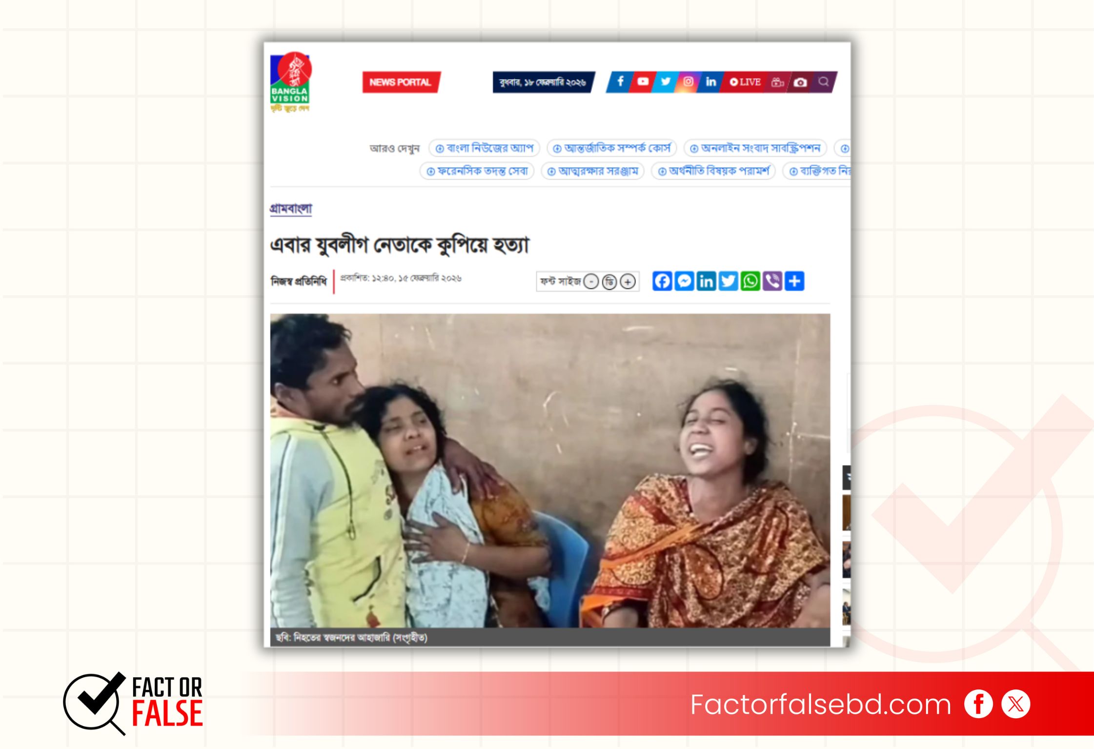 প্রাসঙ্গিক কি-ওয়ার্ড সার্চ করলে বাংলা ভিশনে ১৫ ফেব্রুয়ারি ২০২৬ এ “এবার যুবলীগ নেতাকে কুপিয়ে হত্যা” শিরোনামে একটি প্রতিবেদন খুঁজে পাওয়া যায়।