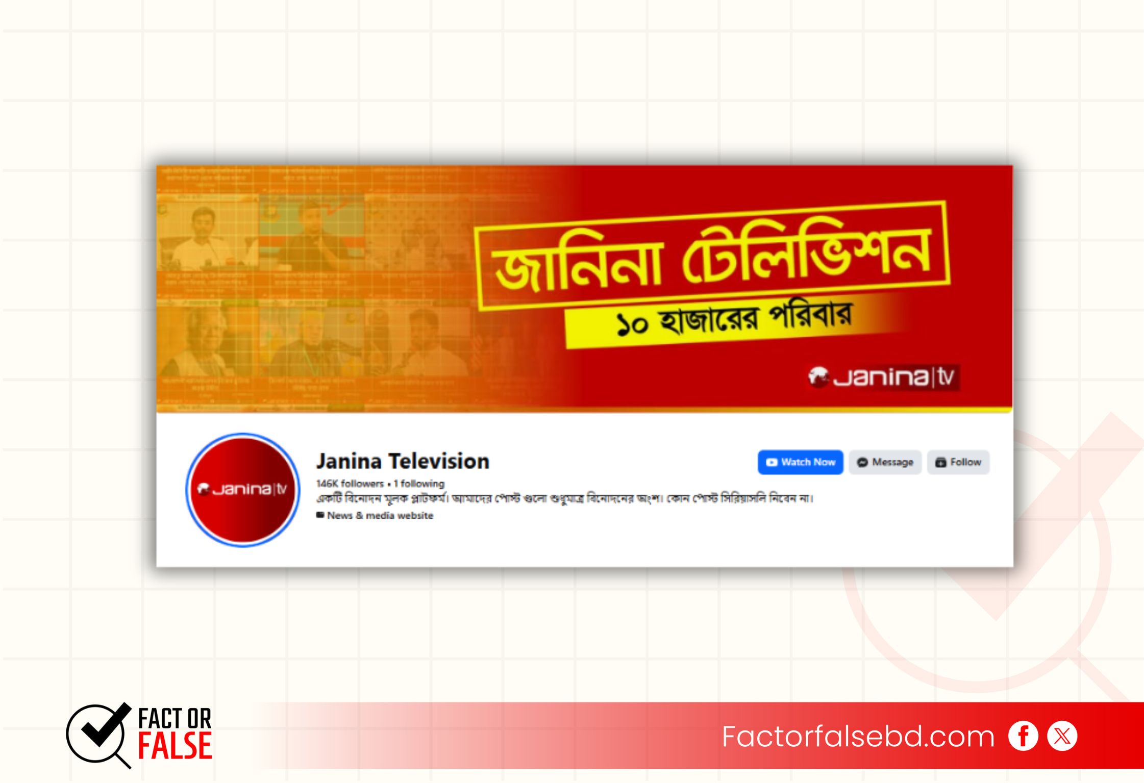 Janina Television এর পেজের বায়োতে উল্লেখ রয়েছে, “একটি বিনোদন মূলক প্লাটফর্ম। আমাদের পোস্ট গুলো শুধুমাত্র বিনোদনের অংশ। কোন পোস্ট সিরিয়াসলি নিবেন না।” মূলত এই পেজটি বিনোদনের উদ্দেশ্যে পরিচালনা করা হয়। এটি কোনো বাস্তব বা প্রকৃত খবরের পেজ নয়।