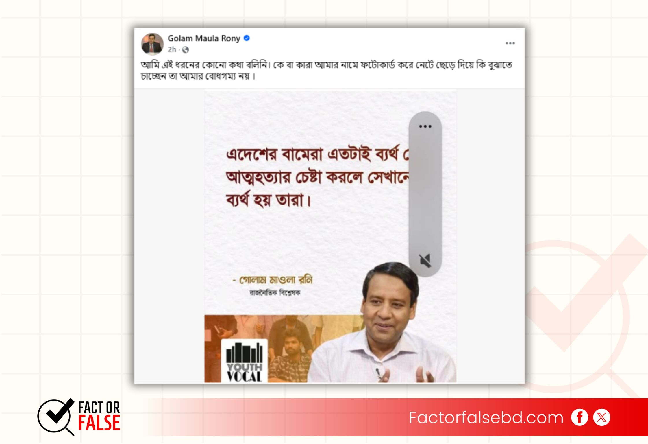 অর্থাৎ, “এদেশের বামেরা এতটাই ব্যর্থ যে, আত্মহত্যার চেষ্টা করলে সেখানেও ব্যর্থ হয় তারা।” শিরোনামে রাজনৈতিক বিশ্লেষক গোলাম মাওলা রনিকে উদ্ধৃতি করে প্রচারিত ফটোকার্ডটি ভুয়া এবং বানোয়াট।