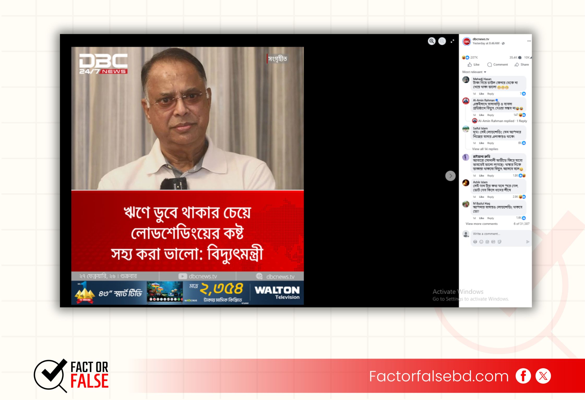“টাকা দিয়ে খাদ্য কেনার থেকে না খেয়ে থাকা ভালো: বিদ্যুৎ মন্ত্রী’” শিরোনামে ডিবিসি নিউজের ডিজাইন সংবলিত একটি ফটোকার্ড প্রচার করা হয়েছে সামাজিক যোগাযোগ মাধ্যম ফেসবুকে।