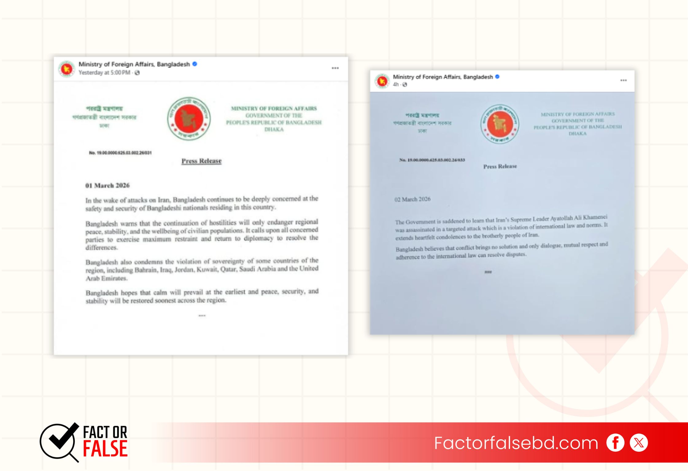 পররাষ্ট্র মন্ত্রণালয়ের ফেসবুক পেজে এই সংঘাত সংক্রান্ত একটি বিবৃতি পাওয়া যায়। বিবৃতিতে বলা হয়, ইরানে হামলার পর বাংলাদেশ সেদেশে বসবাসকারী বাংলাদেশি নাগরিকদের নিরাপত্তা নিয়ে গভীরভাবে উদ্বিগ্ন।