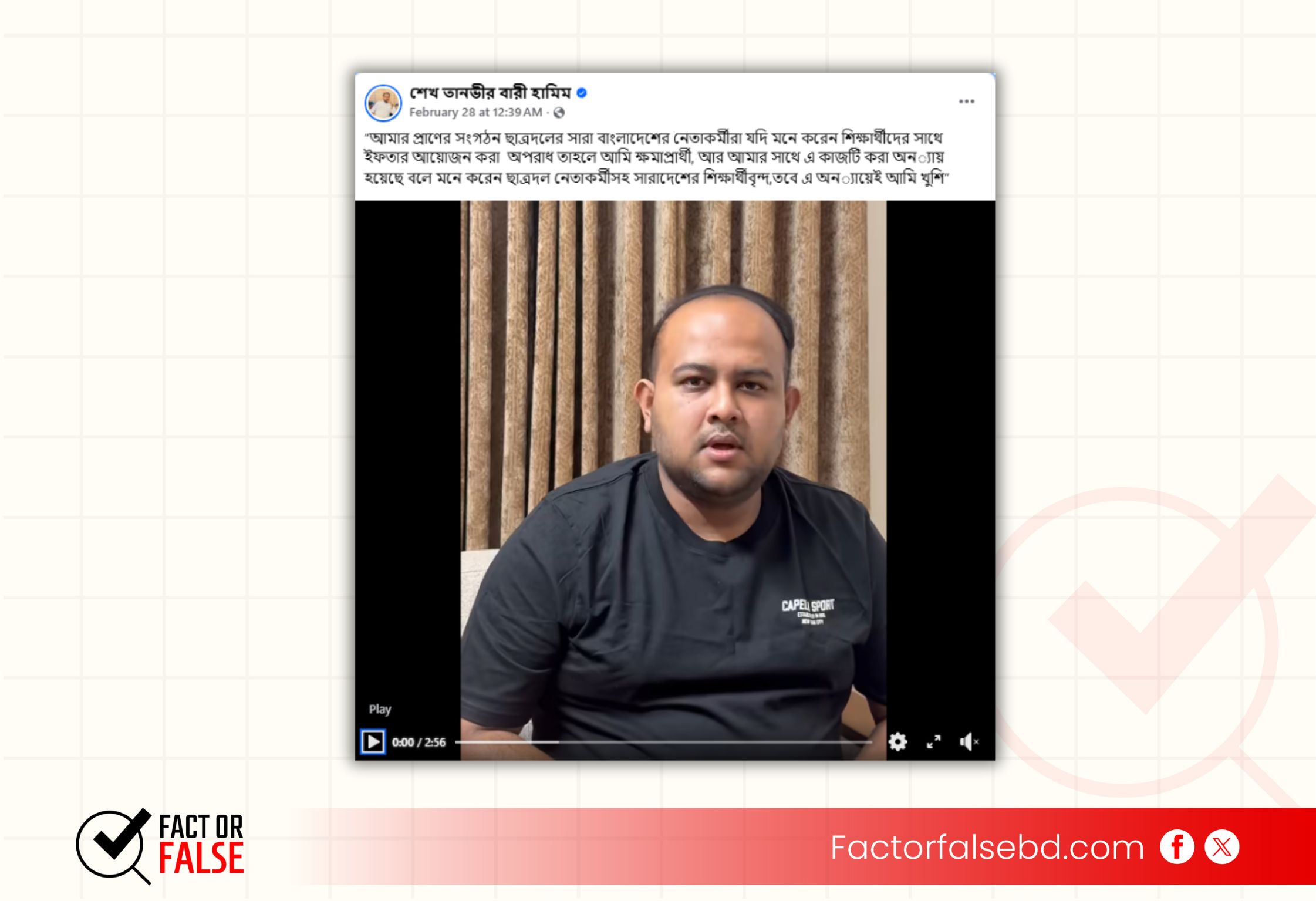 শেখ তানভীর বারী হামিমের ফেসবুক প্রোফাইলে গত ২৮ ফেব্রুয়ারি প্রচারিত একটি ভিডিওবার্তা খুঁজে পাওয়া যায়। ক্যাপশনে উল্লেখ রয়েছে, “আমার প্রাণের সংগঠন ছাত্রদলের সারা বাংলাদেশের নেতাকর্মীরা যদি মনে করেন শিক্ষার্থীদের সাথে ইফতার আয়োজন করা অপরাধ তাহলে আমি ক্ষমাপ্রার্থী, আর আমার সাথে এ কাজটি করা অন্যায় হয়েছে বলে মনে করেন ছাত্রদল নেতাকর্মীসহ সারাদেশের শিক্ষার্থীবৃন্দ,তবে এ অন্যায়েই আমি খুশি”