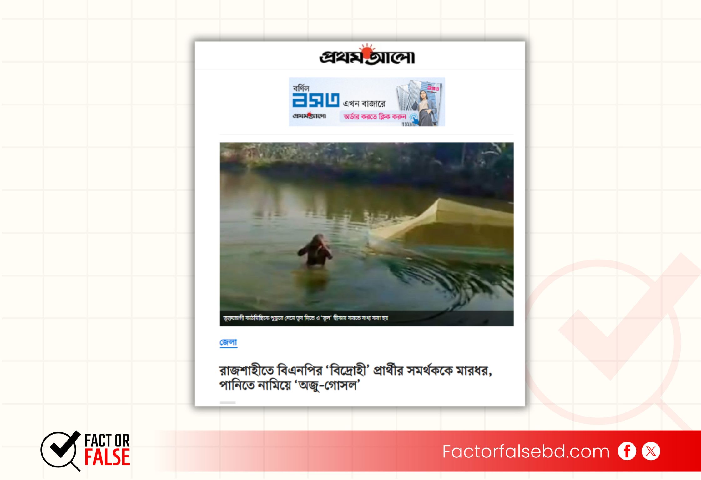 প্রাসঙ্গিক কি-ওয়ার্ড সার্চ করলে প্রথম আলোর ওয়েবসাইটে “রাজশাহীতে বিএনপির ‘বিদ্রোহী’ প্রার্থীর সমর্থককে মারধর, পানিতে নামিয়ে ‘অজু–গোসল” শিরোনামে একটি প্রতিবেদন পাওয়া যায়।