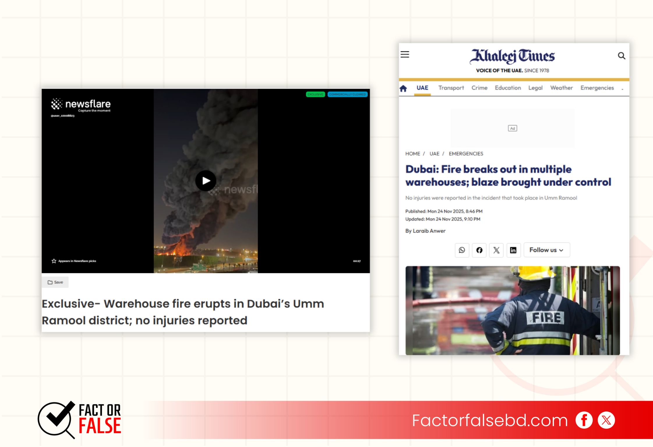 ভিডিওটির কি-ফ্রেম রিভার্স ইমেজ সার্চ করলে Newsflare এর ওয়েবসাইটে ২০২৫ সালের ২৬ নভেম্বর প্রকাশিত একটি ভিডিও পাওয়া যায়, যার সঙ্গে আলোচিত ভিডিওটির সম্পূর্ণ সাদৃশ্য রয়েছে। ভিডিওটির ক্যাপশন থেকে জানা যায়, এটি দুবাইয়ের উম্মে রামুল এলাকায় গুদামে আগুন লাগার ঘটনার দৃশ্য।
