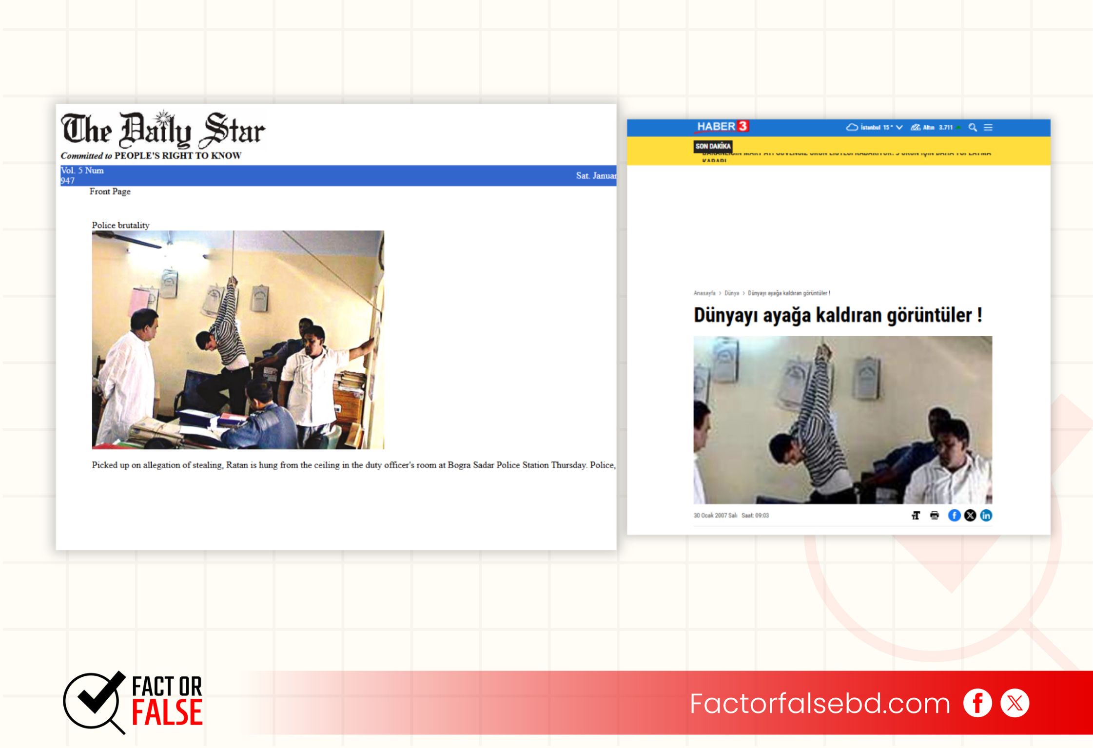 ফ্যাক্ট অর ফলস এর যাচাইয়ে দেখা যায়, রশিতে ঝুলিয়ে পেটানো ব্যক্তি বিএনপির ভারপ্রাপ্ত চেয়ারম্যান তারেক রহমান নন বরং, ২০০৭ সালে রতন কুমার নামে চুরির অভিযোগে অভিযুক্ত একজনকে বগুড়া সদর পুলিশ স্টেশনে নির্যাতনের ভিডিও; যা আলোচিত দাবিতে প্রচার করা হয়েছে।
