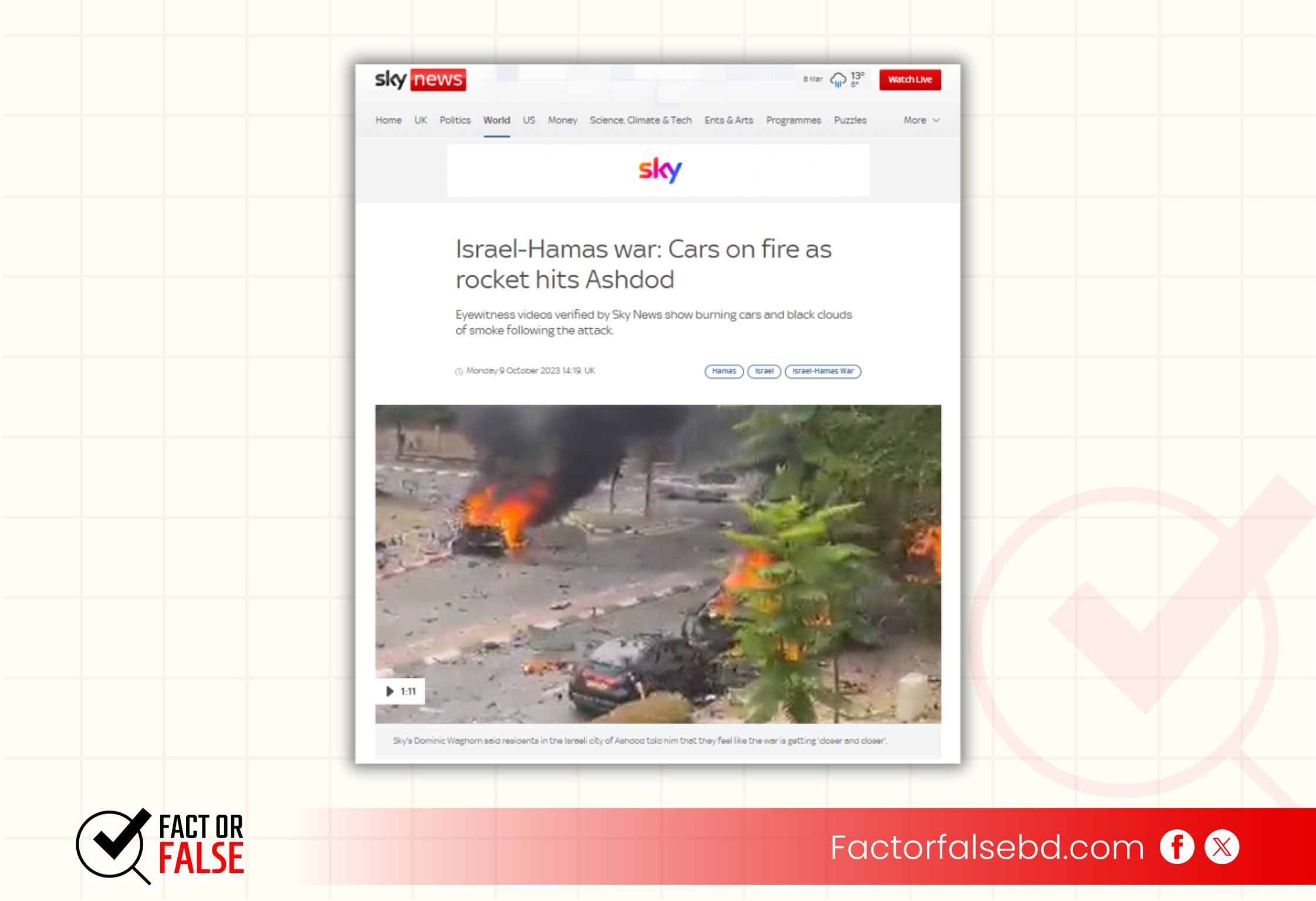 আলোচিত ভিডিওটির কি-ফ্রেম রিভার্স ইমেজ সার্চ করলে মার্কিন গণমাধ্যম স্কাই নিউজের ওয়েবসাইটে  ২০২৩ সালের ৯ অক্টোবর একই ভিডিওটি প্রচারিত হতে দেখা যায়।