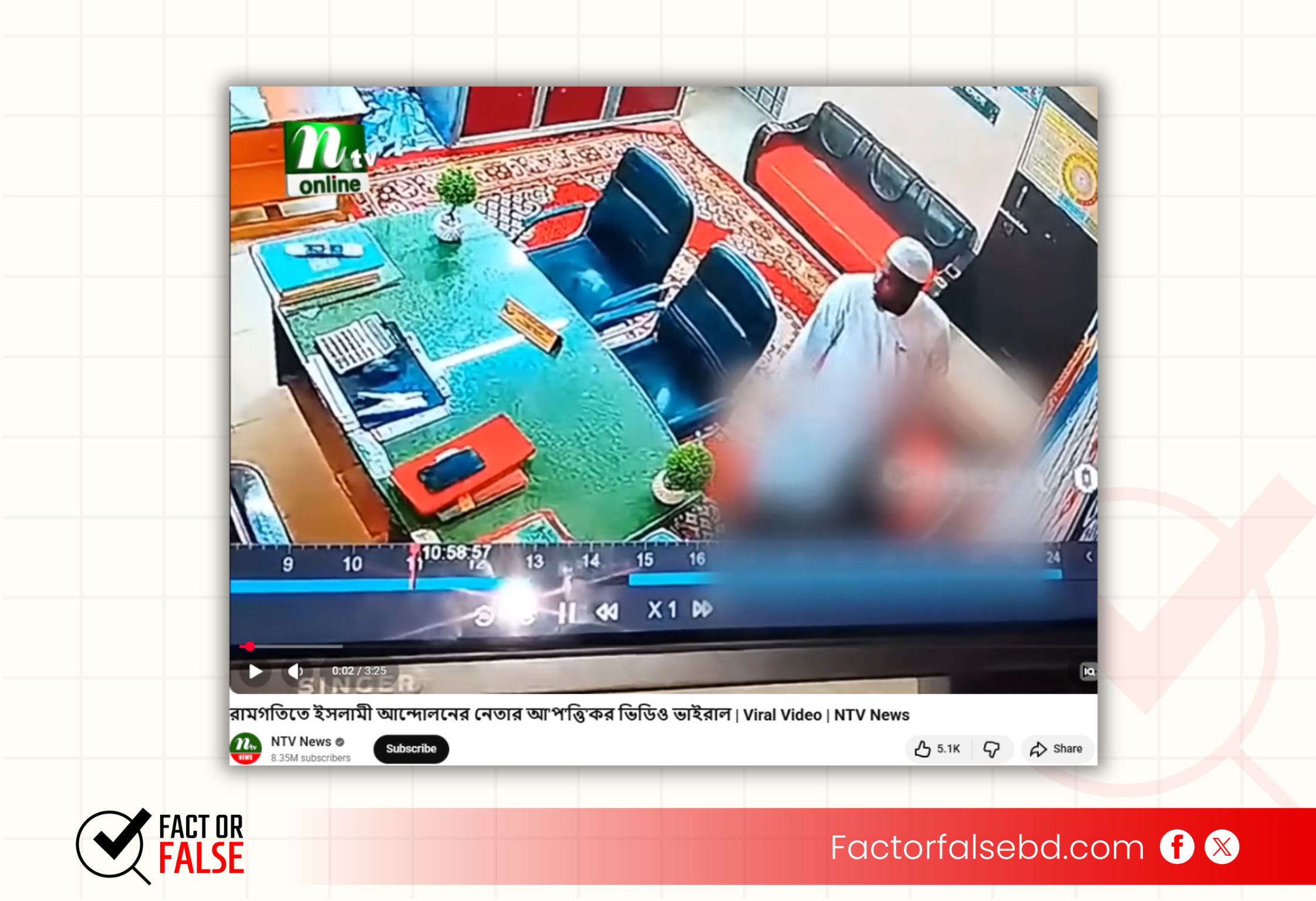 প্রাসঙ্গিক কি-ওয়ার্ড সার্চে এনটিভির ফেসবুক পেজ ও ইউটিউব চ্যানেলে একটি ভিডিও প্রতিবেদন খুঁজে পাওয়া যায়। ক্যাপশনে লেখা হয়, “রামগতিতে ইসলামী আন্দোলনের নেতার আপত্তিকর ভিডিও ভাইরাল।” বিস্তারিত প্রতিবেদনেও ওই ব্যক্তির পদ উল্লেখ করে তাকে ইসলামী আন্দোলনের নেতা হিসেবে পরিচয় করিয়ে দেওয়া হয়।