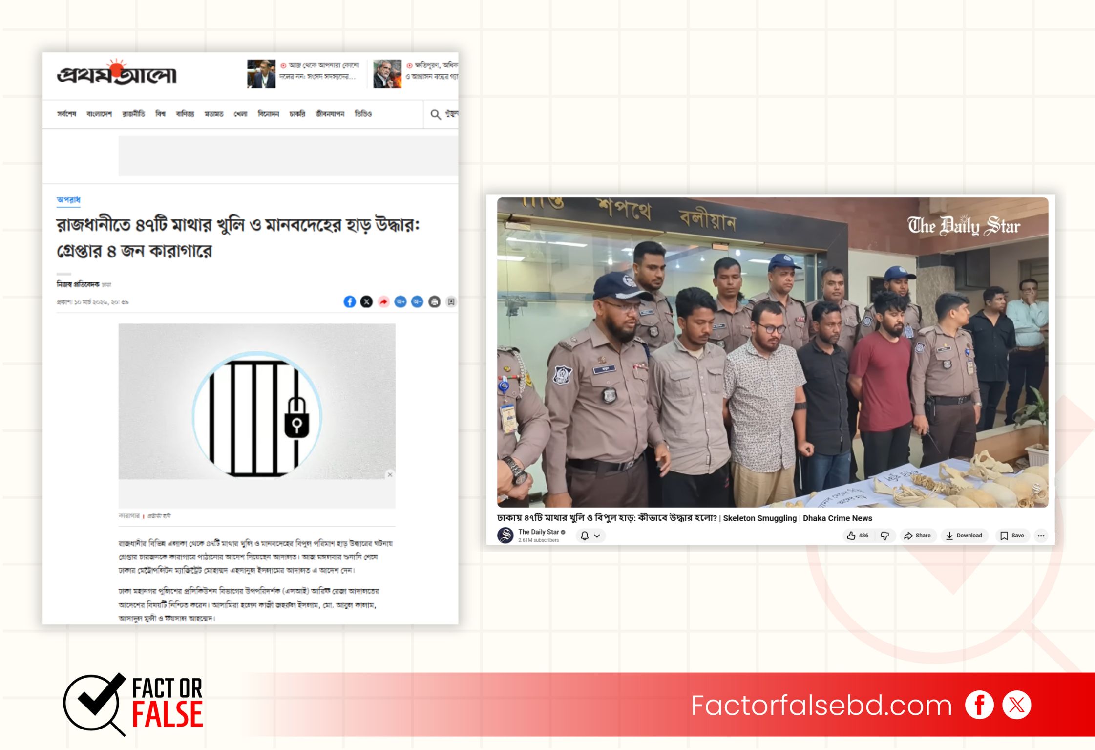 আলোচিত ভিডিওটির কী-ফ্রেম রিভার্স ইমেজ সার্চ করলে মূলধারার সংবাদমাধ্যম প্রথম আলোতে ১০ মার্চ ২০২৬ এ “রাজধানীতে ৪৭টি মাথার খুলি ও মানবদেহের হাড় উদ্ধার: গ্রেপ্তার ৪ জন কারাগারে” শিরোনামে একটি প্রতিবেদন খুঁজে পাওয়া যায়।