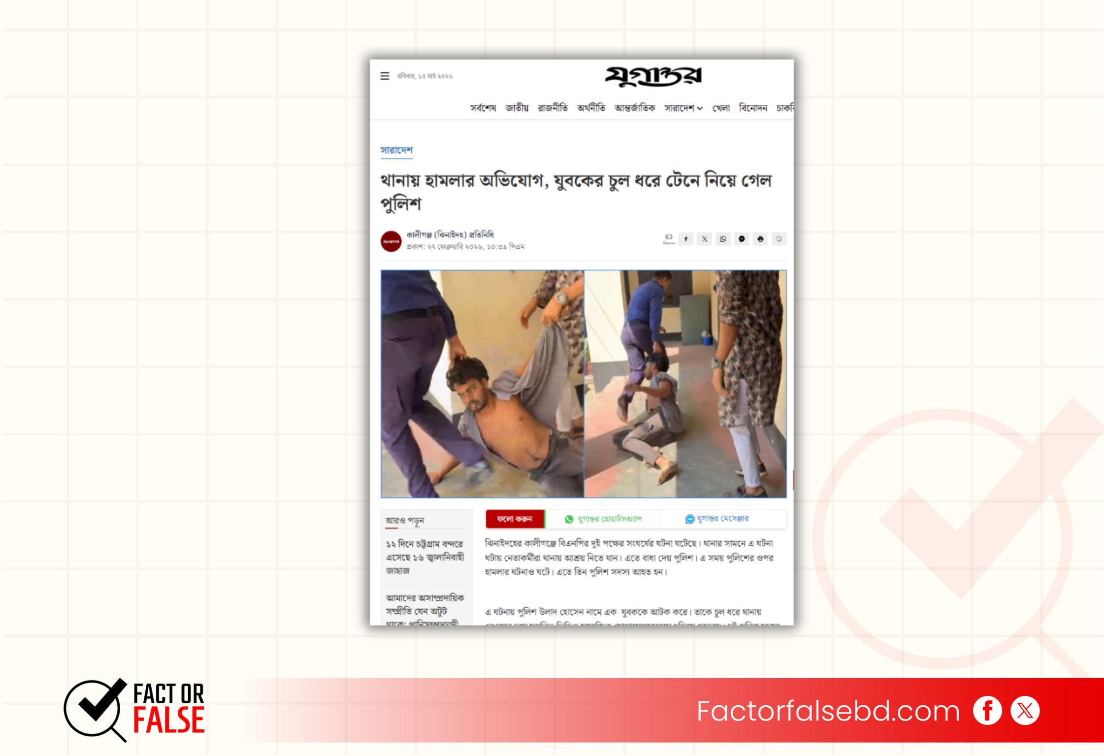 আলোচিত ভিডিওটির কী-ফ্রেম রিভার্স ইমেজ সার্চের মাধ্যমে দৈনিক যুগান্তরের ওয়েবসাইটে গত ২৭ ফেব্রুয়ারিতে “থানায় হামলার অভিযোগ, যুবকের চুল ধরে টেনে নিয়ে গেল পুলিশ” শিরোনামে প্রকাশিত একটি প্রতিবেদন খুঁজে পাওয়া যায়। প্রতিবেদনে ব্যবহৃত ছবির সাথে আলোচিত ভিডিওর কি-ফ্রেমের মিল রয়েছে।